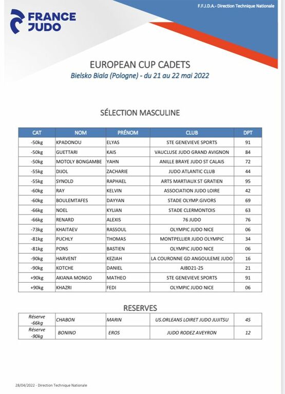 Suite à sa médaille de bronze à l’European Cup Cadets de Strasbourg le 23 avril dernier, Raphaël SYNOLD de L’AM Saint-Gratien est sélectionné dans la catégorie -55kg pour l’European Cup Cadets de Pologne le 21 et 22 mai prochain.