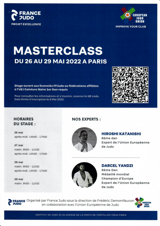 Dans le cadre du projet excellence sous la direction de Frédéric DEMONTFAUCON, France Judo et l'Union Européenne de Judo proposent une MASTERCLASS du 26 au 29 mai 2022 à l'Institut du Judo à Paris.
